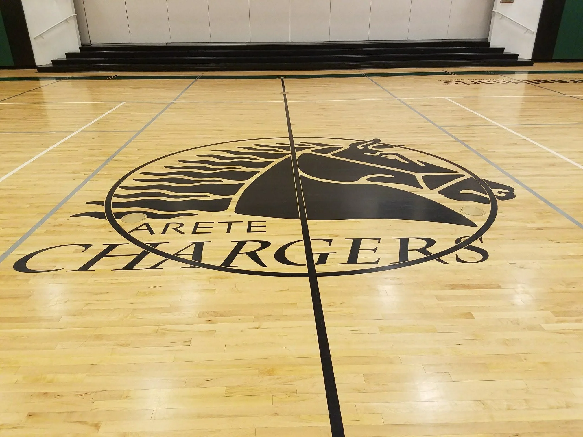 Example: This school had a generic horse mascot that did not fit its classical focus. I redesigned it as a charger crest inspired by ancient Greek pottery, creating a scholarly, strong identity that reads on uniforms and at center court.